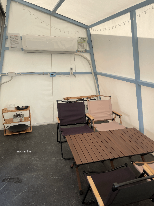 무더운 여름이었지만 에어컨이 있어 시원한 텐트 안에서 더위를 피할 수 있었다. 냉난방기가 준비되어 있어 더위와 추위에도 쾌적한 캠핑을 즐길 수 있다. 캠핑 의자, 테이블, 바베큐 그릴이 야외에 준비되어 있고, 텐트 안에도 그릴, 버너, 4인 테이블이 준비되어 있다.