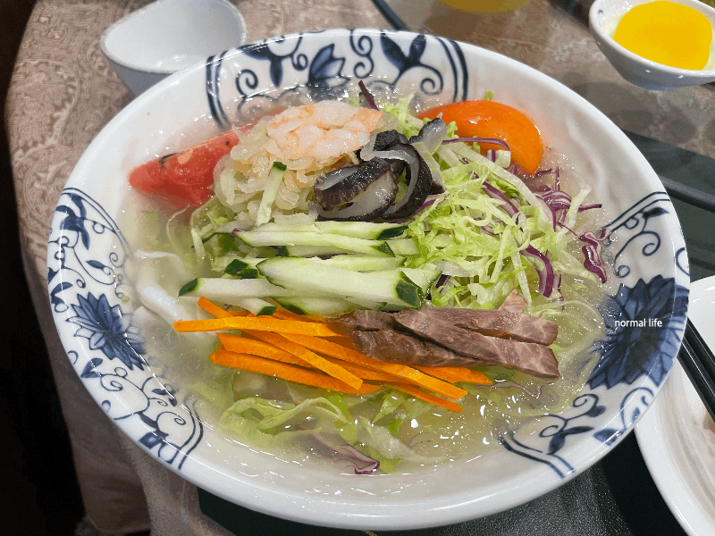 한국 중식당에서 여름에만 맛볼 수 있는 계절메뉴 중국냉면이다. 얼음이 자박한 육수에 장육, 새우, 해삼, 해파리, 오이, 당근, 양배추, 토마토, 수박이 고명으로 올라간다. 땅콩소스를 기호에 따라 넣어 맛보면 또 다른 중국냉면을 즐길 수 있다.