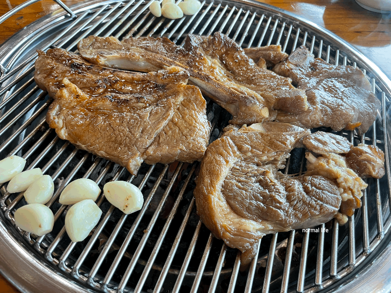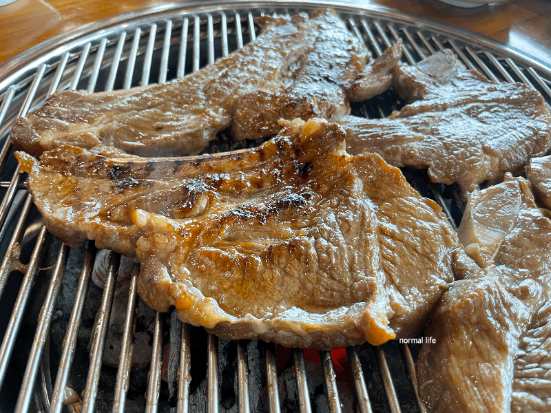 달궈진 불판 위에 양념을 숙성시킨 돼지갈비를 올려 맛보았다. 숯불에 구운 특유의 고기맛과 부드럽고 육즙이 가득했다.