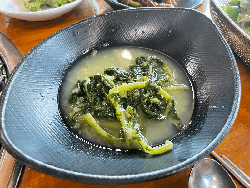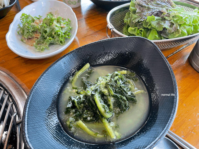 여름에 맛봐야 할 제철인 열무김치가 돼지갈비와 잘 어울렸다. 고춧가루 없이 청양고추를 갈아 만들어 깔끔하면서 아삭한 식감이 매력적이다.