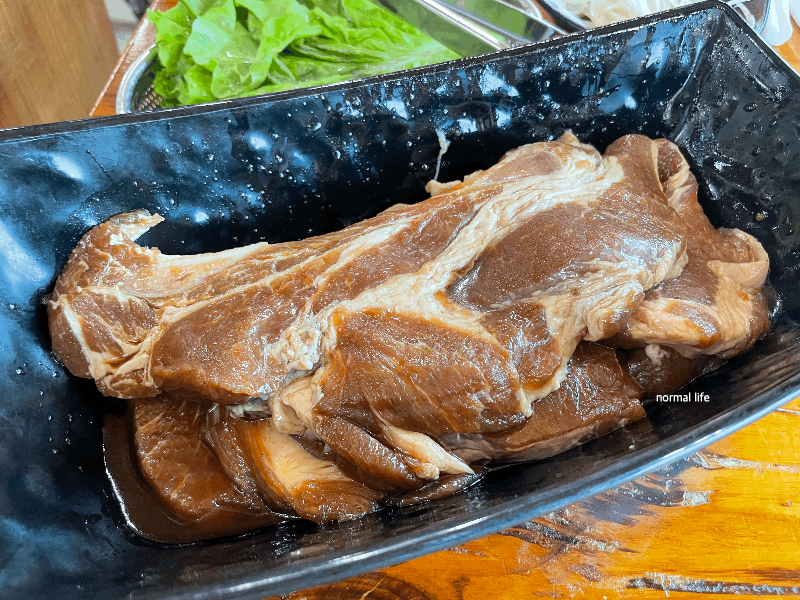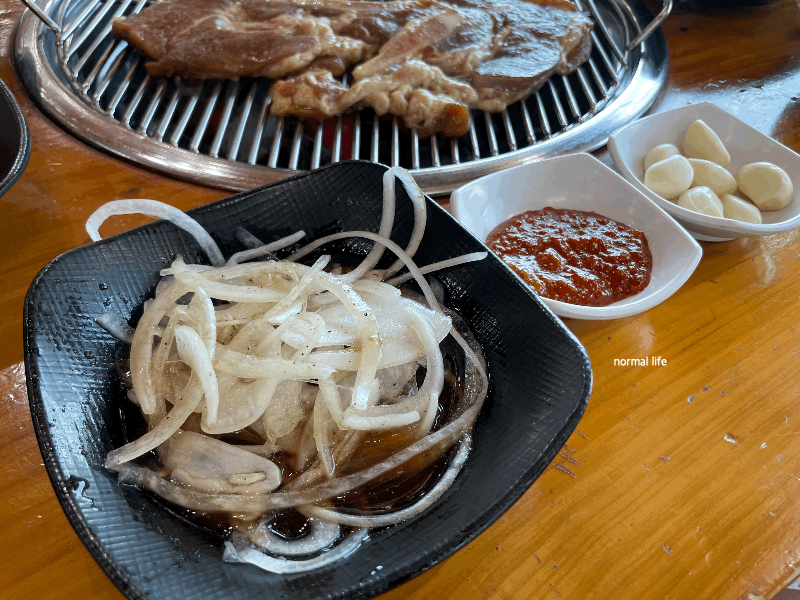 돼지갈비만으로도 충분히 맛있었지만 양파 저림과 상추와 곁들여 맛보면 더욱 맛있게 맛볼 수 있다.