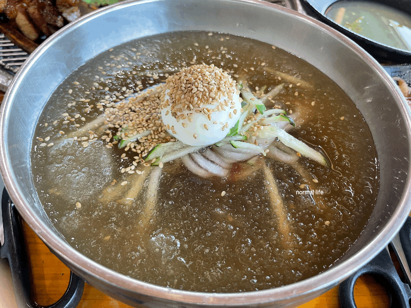 돼지갈비 맛본 후 빠질 수 없는 시원한 물냉면이다. 새콤달콤한 육수가 입맛을 확 살려줬다. 숯불에 구운 돼지갈비 한 점과 냉면과 함께 맛보면 또 다른 별미이다.