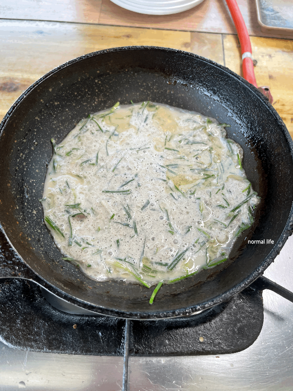 준비된 프라이팬에 기름을 넉넉히 두르고 도토리가루, 부추를 넣어 반죽한 부침개를 셀프로 구워 맛있게 맛보았다.