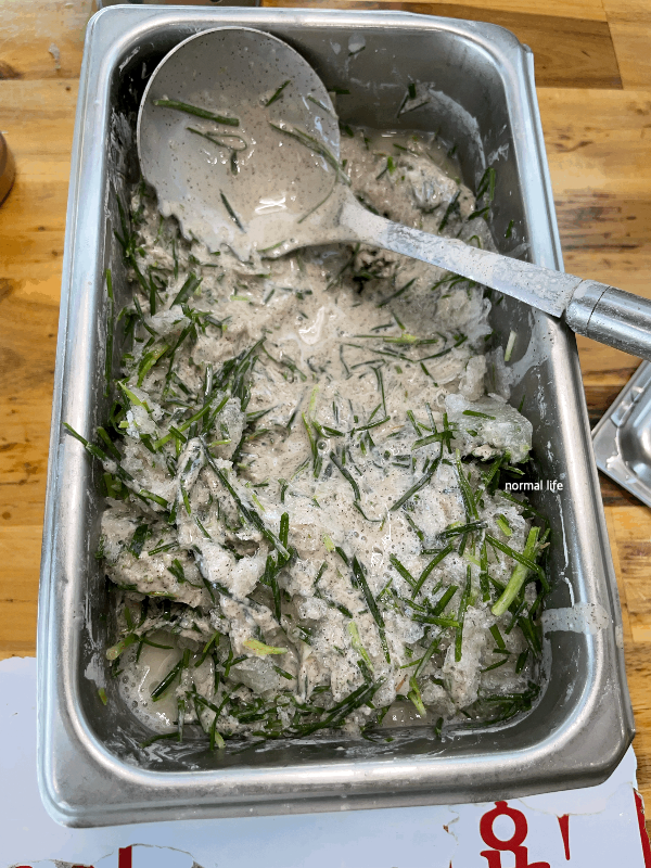 준비된 프라이팬에 기름을 넉넉히 두르고 도토리가루, 부추를 넣어 반죽한 부침개를 셀프로 구워 맛있게 맛보았다.