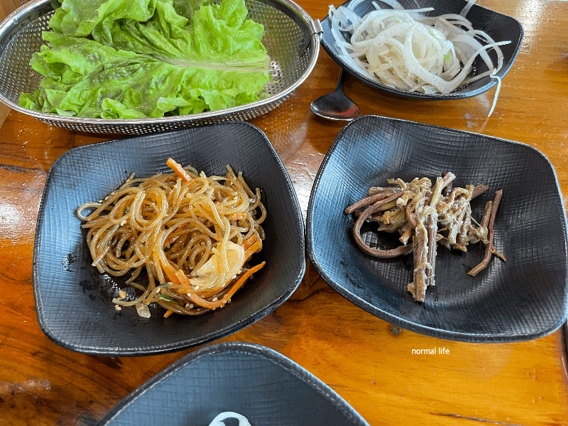 고사리나물, 잡채, 김치, 블루베리 드레싱 샐러드, 연근 샐러드, 고추, 마늘, 쌈채소, 양파 저림 등 맛깔스러운 밑반찬이 제공된다.