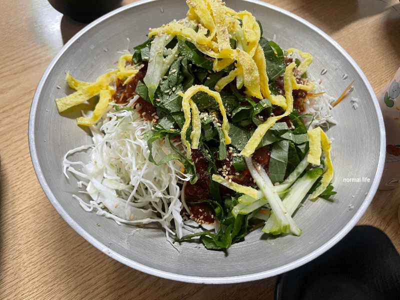 빨간 양념장, 깻잎, 오이, 양배추, 지단이 먹음직스럽게 올라간 비빔면이다. 보기만 해도 푸짐한 양이다. 아삭아삭한 채소들 씹히는 맛이 여름의 맛을 느낄 수 있다. 새콤달콤한 비빔면과 반월소바의 돈까스를 함께 맛보면 또 다른 별미이다.