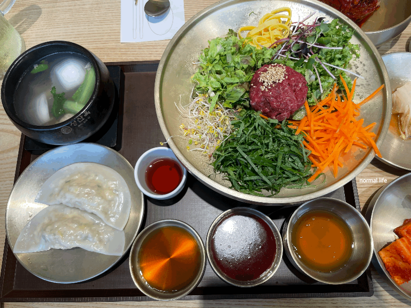 아침, 저녁 15개 한정판매하는 평양물냉면, 사태 수육, 녹두빈대떡, 굴림만두 구성의 성산면상은 성산옥의 대표메뉴이다. 정갈한 한상차림의 성산면상을 맛보고 싶었으나 오후 3시에 방문하여 맛볼 수 없었다. 대신 한우육회비빔밥과 평양만두, 탕국을 함께 맛볼 수 있는 한우육회비빔밥반상을 맛보았다. 부드러운 한우 육회와 각종 야채와 함께 맛보는 신선한 육회비빔밥이다.
