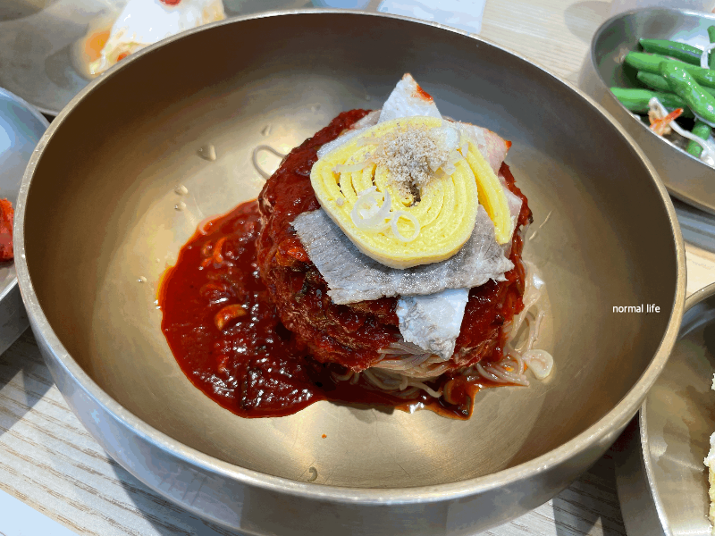 자가제면한 고운 메밀면 위에 빨간 양념장과 고기, 무김치, 지단의 단출한 고명이 올라간 평양비빔냉면이다. 단출해 보이지만 감칠맛 가득한 평양냉면의 매력이 가득 느껴지는 비주얼이다. 빨간 양념이 자극적으로 보이지만 삼삼하면서 담백함 가득한 평양비빔냉면이다. 테이블마다 올려져 있는 다시마식초를 더해 감칠맛을 더할 수 있다.