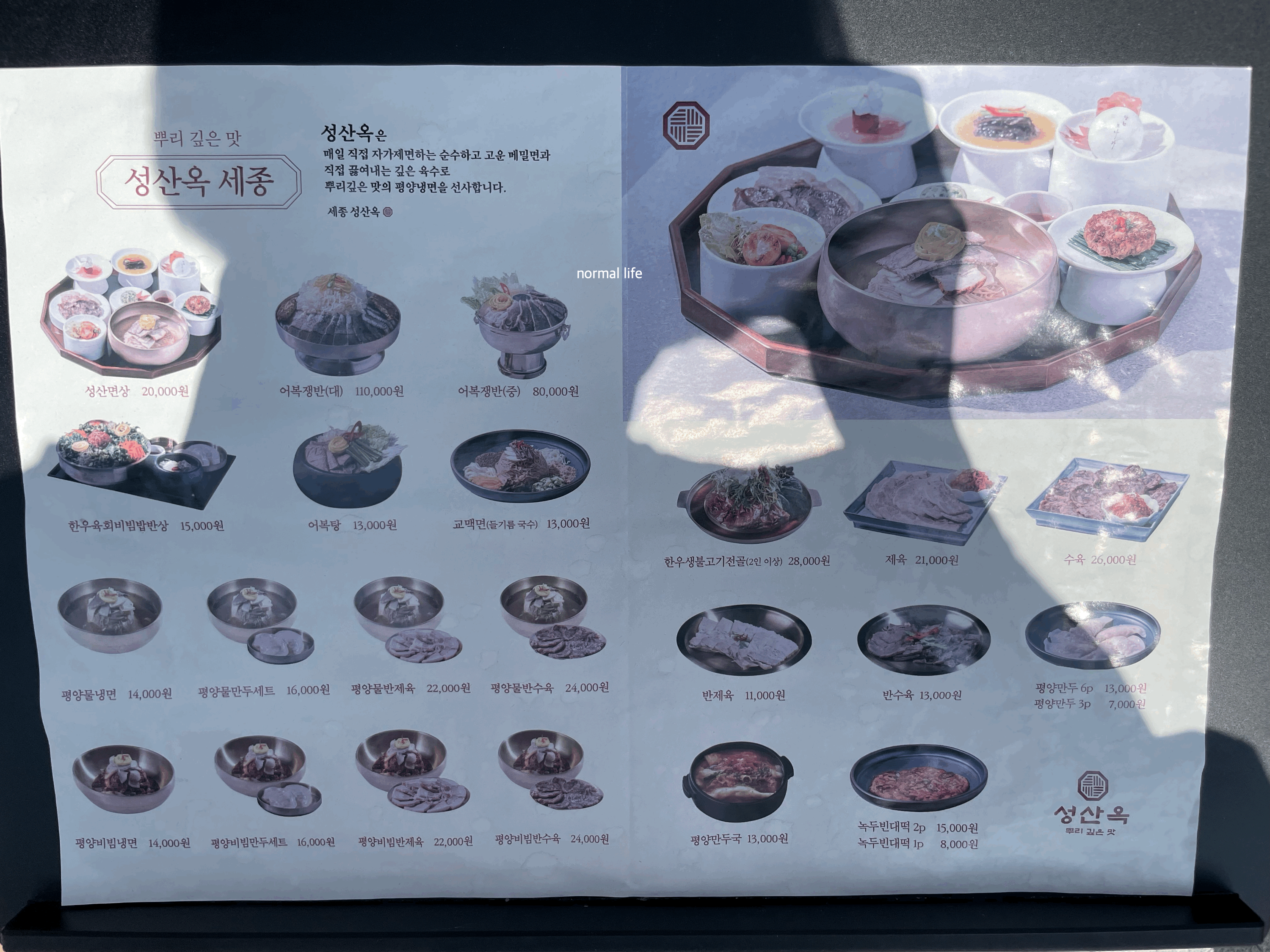 점심과 저녁 15개 한정 판매하는 성산면상 20,000원이다. 평양물냉면, 사태수육, 굴림만두, 녹두빈대떡 구성으로 잘 차려진 한상차림을 맛볼 수 있다. 평양식 요리인 어복쟁반(대) 11,000원 (중) 80,000원 어복탕 13,000원 평양물냉면 14,000원 평양비빔냉면 14,000원 평양만두국 13,000원이다. 들기름국수 13,000원 한우육회비빔밥반상 15,000원 등 다양한 한식을 맛볼 수 있다.