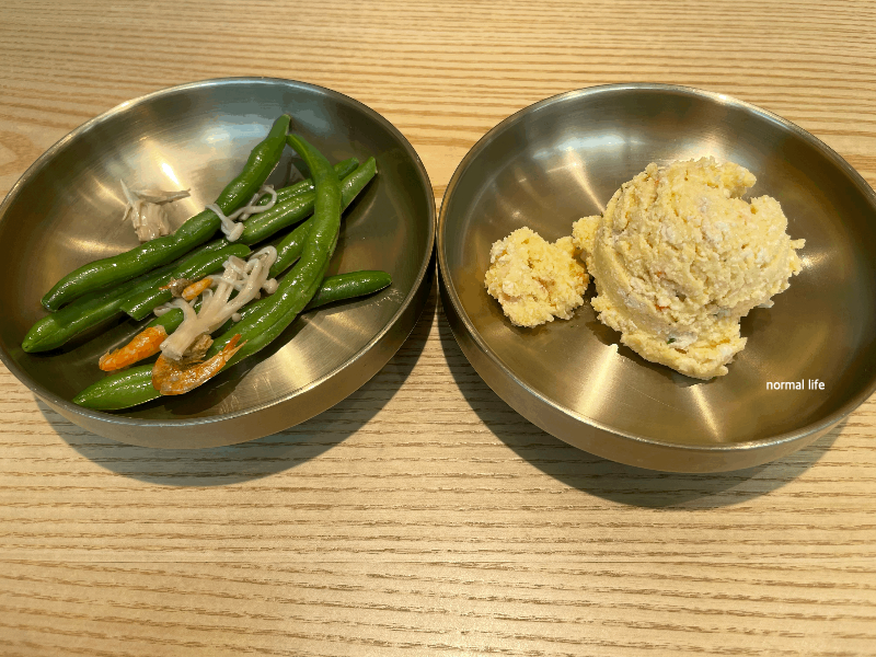 가니쉬 채소인 그린빈과 팽이버섯, 건새우를 살짝 볶아낸 그린빈볶음이다. 고구마와 두부를 넣어 만든 고구마샐러드가 담백하면서 고소했다. 담백하면서 고소한 맛 가득한 샐러드를 즐기며 메인메뉴를 기다릴 수 있다.