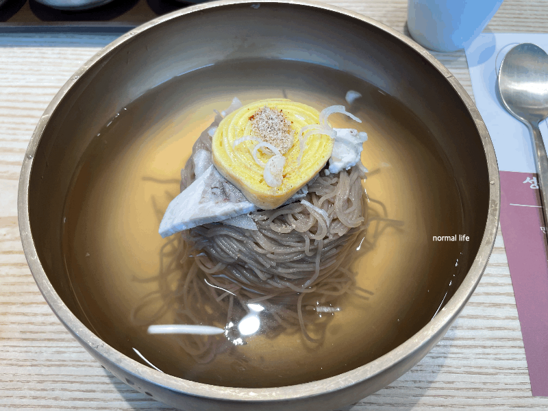 여름철 꼭 맛봐야 하는 평양물냉면이다. 한우사태를 직접 끓여낸 깊은 육수와 고운 메밀면이 조화롭다. 100% 제주 메밀을 주문과 동시에 직접 자가제면을 하여 곱고 고소한 메밀면을 맛볼 수 있다. 직원분이 성산옥의 평양물냉면 맛있게 먹는 TIP은 다시마식초를 넣어 맛보는 것을 추천해 주셨다. 평양물냉면의 오리지널 감칠맛을 맛본 후 기호에 따라 다시마식초를 추가해서 맛보면 다채로운 평양물냉면을 맛볼 수 있다.