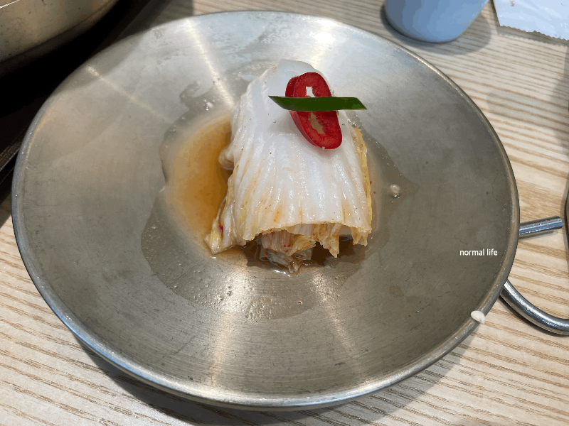 소금과 약간의 고춧가루로 간을 한 담백하고 시원한 맛이 일품인 평양식 백김치이다. 담백하면서 아삭아삭함이 육회비빔밥과 평양냉면과도 조화롭다. 큼지막하게 썰어 나온 섞박지와 평양식 백김치만으로도 여느 반찬 부럽지 않다.