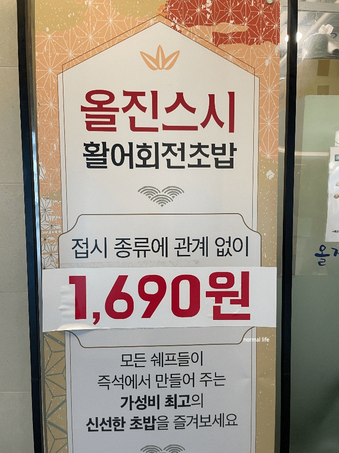 매일 아침 공수받는 노르웨이 슈페리어 등급의 연어로 만든 연어초밥이다. 노르웨이산 생연어로 만든 생연어초밥, 연어양파초밥, 연어뱃살초밥, 연어스테이크초밥을 취향대로 골라서 맛볼 수 있다. 가성비 최고의 올진스시는 한 접시 1,690원에 2 PCS의 신선한 초밥을 맛볼 수 있다.