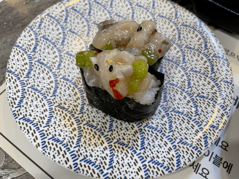 식감이 연하고 쫄깃한 올진스시의 타코와사비군함이다. 와사비 특유의 알싸함이 매력적이다.