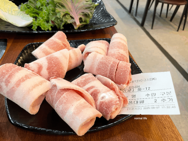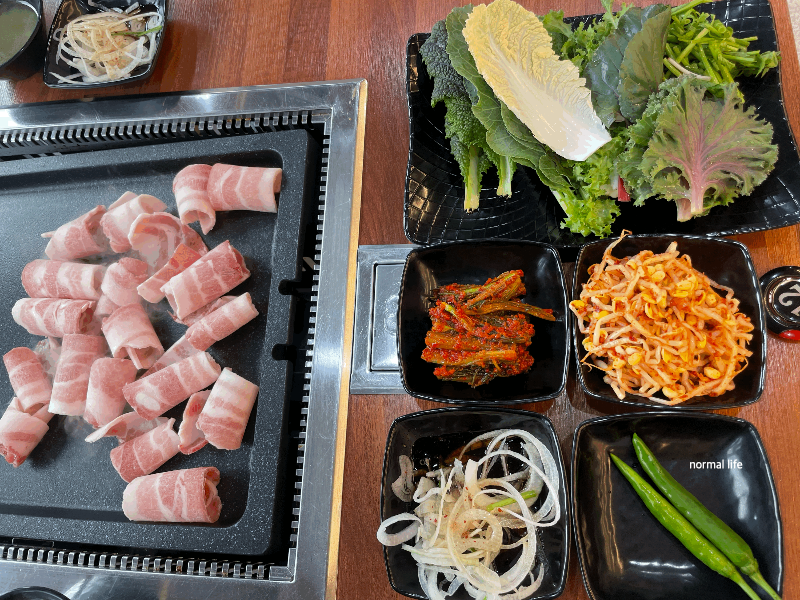넓은 불판에 한돈명품대패를 올리고 신선한 쌈채소와 맛깔스러운 반찬들로 맛있는 한상차림을 셀프로 준비했다.