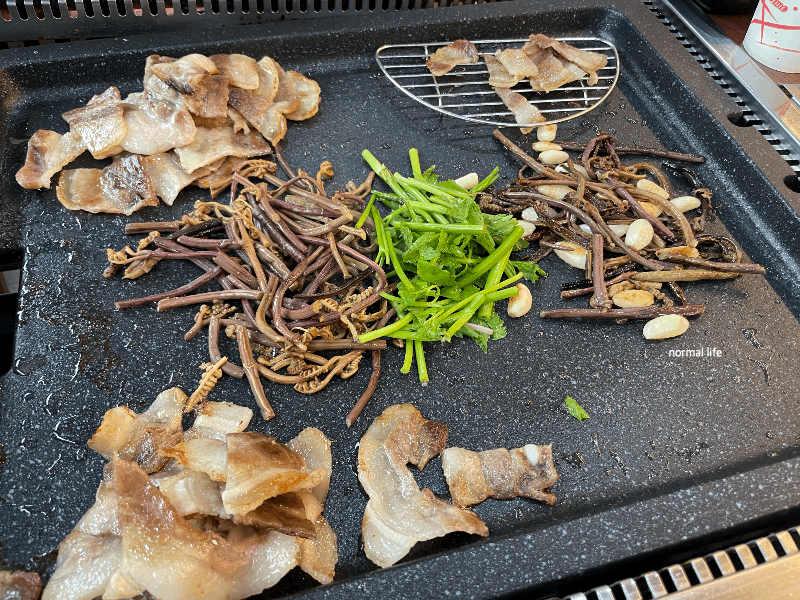 콩나물무침, 김치, 파김치, 갓김치도 준비되어 있어 함께 맛볼 수 있다. 불판 위에 고기와 다양한 구이류, 아삭한 콩나물무침을 올려 함께 맛보는 것을 추천한다.