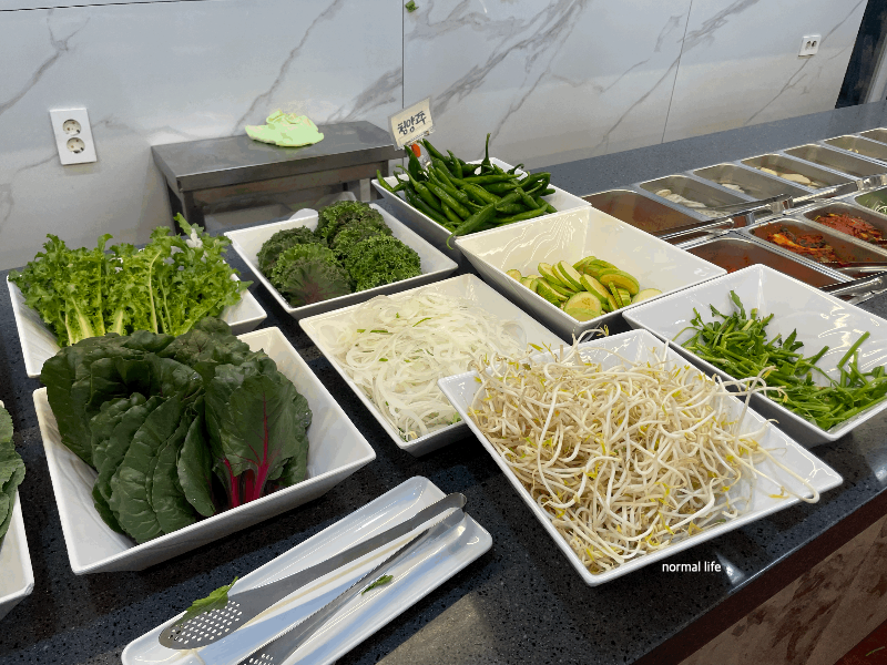 소고기, 돼지고기, 대패삼겹과 함께 즐길 수 있는 다양하고 신선한 쌈채소가 셀프바에 준비되어 있다. 적상추, 적겨자, 청상추, 배추, 깻잎, 쌈케일, 청겨자, 치커리, 적근대 등의 신선한 쌈채소를 마음껏 무제한으로 맛볼 수 있다.