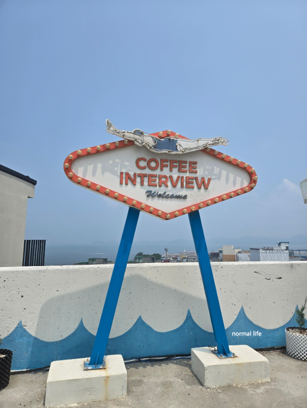 커피인터뷰 입구에 마련된 포토존이다. 화이트 색감과 푸른 서해바다를 배경으로 예쁜 사진을 남기기에 좋은 포토존이다. 커피인터뷰의 포토존에서 대천에서의 여행 추억을 꼭 한번 남기길 추천하고 싶다.