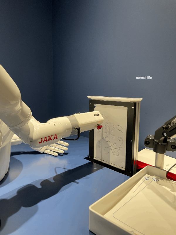 6개의 관절로 쓱싹쓱싹 그림을 그리는 그림로봇이다. 6개의 관절로 자유롭게 움직이며 카메라로 찍은 인물을 AI로 인식해서 그림을 그려준다.