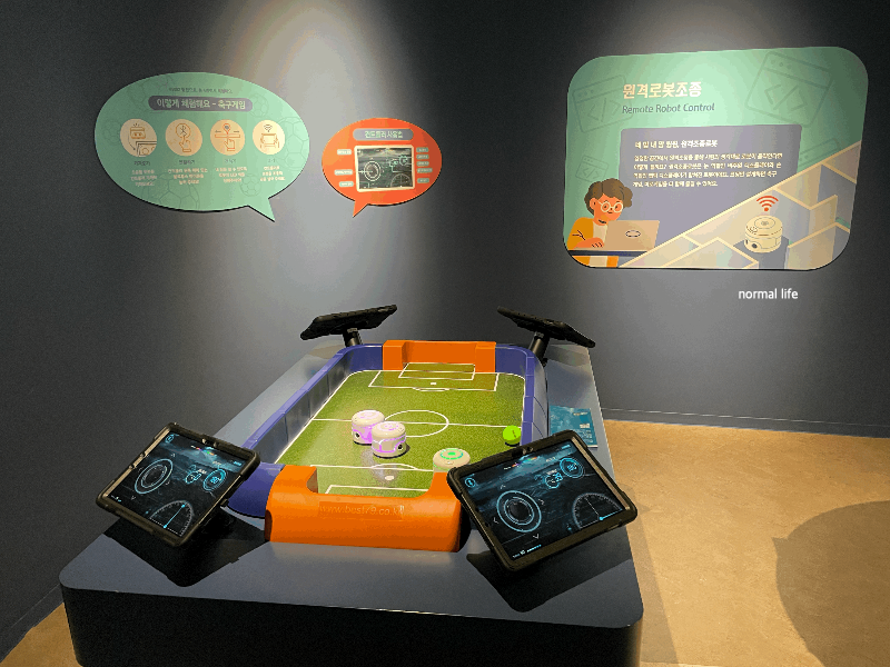 2대 2 팀전으로 총 4명이 함께 체험할 수 있는 축구게임이다. 축구게임 방법은 1. 조종할 로봇을 컨트롤러 가까이 가져온다 2. 컨트롤러 왼쪽 위 블루투스 아이콘을 누른다. 3. 나의 팀을 알 수 있도록 로봇의 LED 색을 정한다. 4. 컨트롤러로 로봇을 조종해 골을 넣는다.