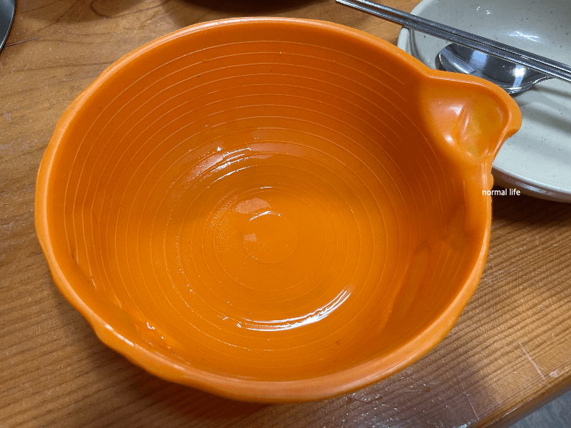 정겨운 주황색 플라스틱 바가지가 인원수대로 제공된다. 조개껍질을 담는 용도로 뜨거운 열기에 녹은 바가지가 세월의 흔적이 느껴진다.