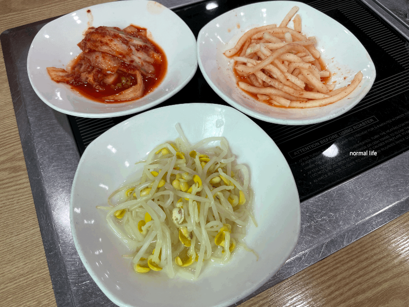 시장정육점식당은 콩나물무침, 무생채, 배추김치가 밑반찬으로 제공된다. 하얀 콩나물무침은 육회비빔밥과 따로국밥에 추가해 넣어 아삭함을 더할 수 있다.