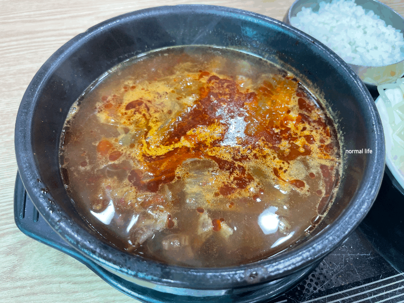 담백한 육개장 스타일로 국내산 한우가 들어간 따로국밥이다. 깊고 매콤한 맛의 육개장보다는 담백하면서 맑고 깨끗한 맛이 특징이다. 큼직한 한우 건더기가 부드러워 든든한 한 끼를 맛볼 수 있다. 알밤이 들어간 육회비빔밥도 맛있었지만 담백하면서 부드러운 한우를 맛볼 수 있는 따로국밥이 내가 뽑은 시장정육점식당 베스트메뉴이다.