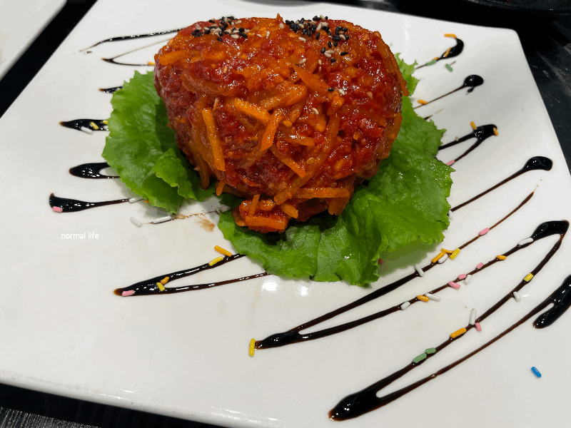 신선한 샐러드, 겉절이, 장조림, 배추김치, 섞박지가 기본찬으로 제공된다. 잡채, 도토리묵, 옥수수, 방울토마토, 고추, 쌈장은 셀프바에 준비되어 있어 자유롭게 이용할 수 있다.