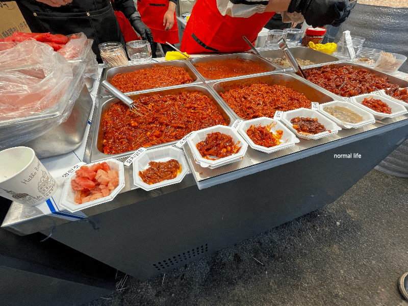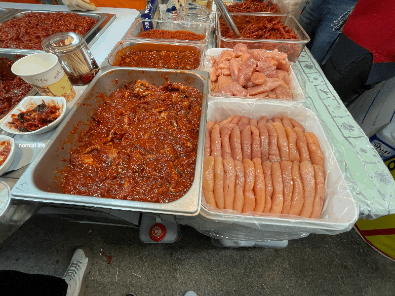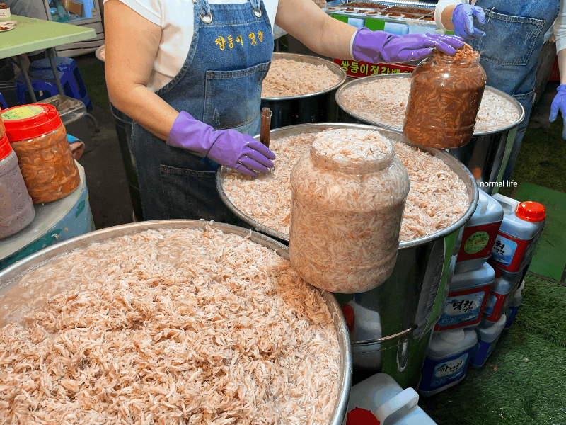 축제기간 중 다양한 젓갈을 맛볼 수 있도록 젓갈판매장마다 준비되어 있었다. 발효된 감칠맛 가득한 젓갈들을 마음껏 맛보면 너무 짤 수 있어 주의해야 한다.