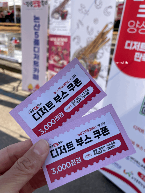 논산 5품 디저트카페존이 마련되어 있어 캠핑테이블에서 디저트와 휴식을 취할 수 있었다. 디저트 부스 만족도 조사를 하면 3,000원 쿠폰을 받을 수 있었다. 디저트카페존에서 사용이 가능해 커피와 아이스티를 1,000원에 이용 수 있었다.