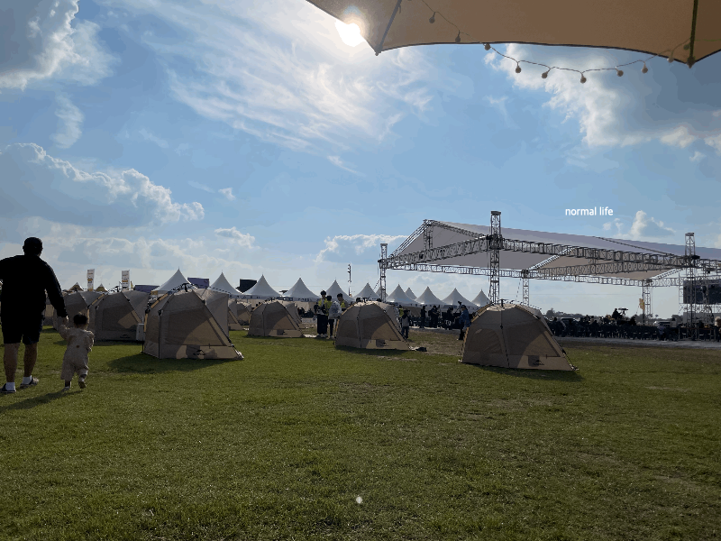 2025 강경젓갈축제에는 먹거리, 즐길거리, 볼거리 그리고 쉼터도 잘 마련되어 있었다. 그늘막, 돔, 캠핑 테이블 등 주무대 주변 잔디 위에 다양한 컨셉의 쉼터가 마련되어 있었다.
