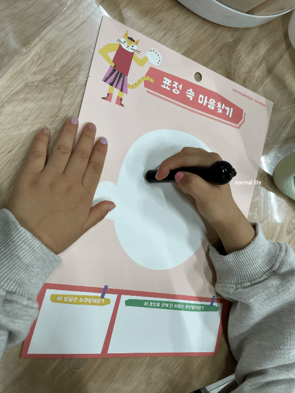 책상에 놓은 거울에 비친 얼굴 표정을 자세히 들여다보며 표현하는 활동지가 마련되어 있다. 아빠와 엄마 얼굴, 딸아이 본인의 얼굴을 관찰하며 스케치하는 모습이 제법 진지해 보인다.
