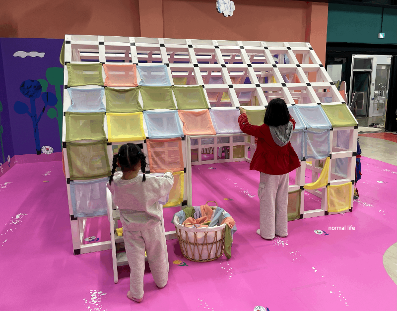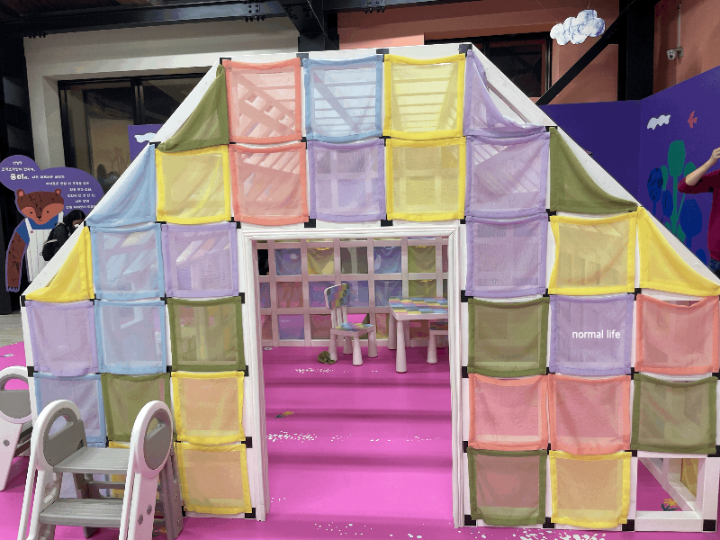 알록달록 조각보로 부드럽고 포근한 집을 지어 볼 수 있는 조각조각집이다. 단단한 철과 벽돌, 유리, 나무 등 다양한 재료들이 있는데 조각보로도 집의 재료가 될 수 있다니 새로운 경험이었다.