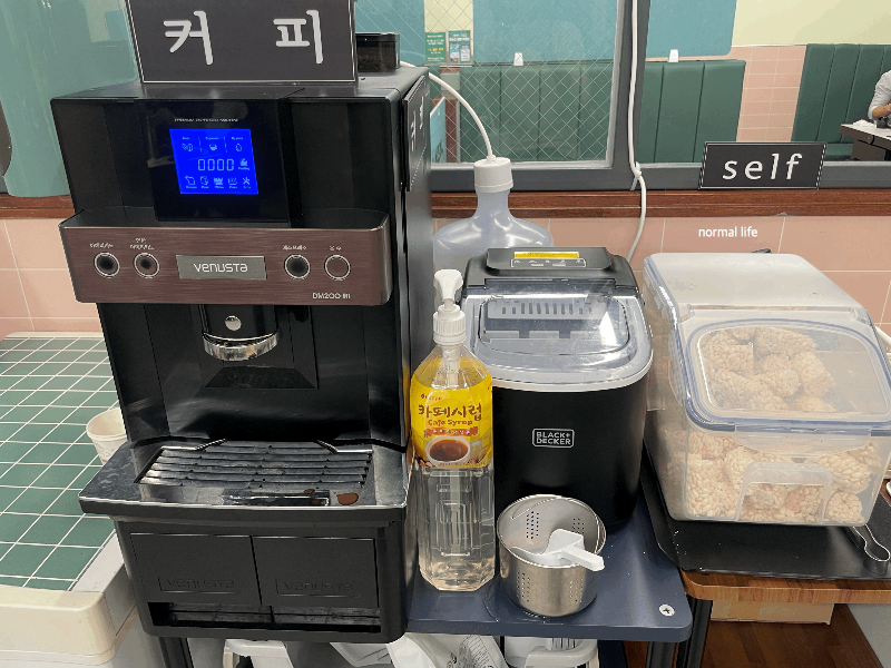 커피머신과 제빙기, 달콤한 뻥튀기, 아이스크림이 식사 후 즐길 수 있게 준비되어 있다. 저녁 마감시간인 8시 50분 이후에도 디저트류는 이용이 가능하다.