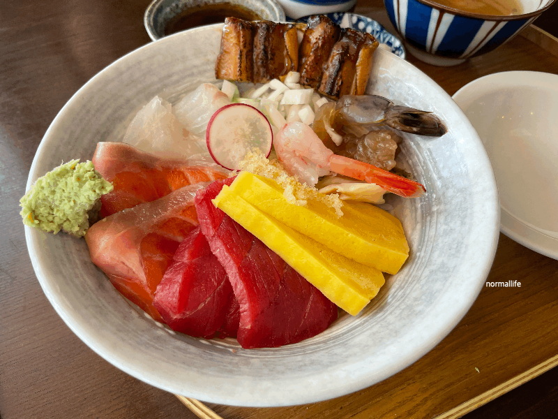 신선한 고급횟감을 한 그릇에 담아낸 일본식 회덮밥 카이센동이다. 흰 살 2, 연어 2, 참치등살 2, 장어 2, 계란 2, 간장새우 1, 단새우 1, 전복 1, 날치알, 양파, 오이가 한 그릇에 담겨 나온다.