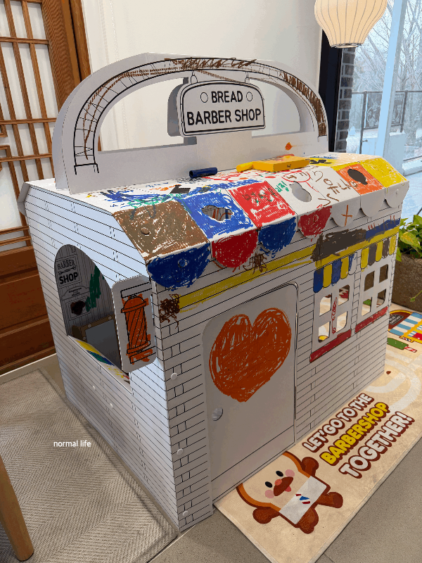 아이들이 마음껏 색칠 할 수 있는 브레드이발소 종이집이다. 브레드이발소 종이집을 크레파스로 마음껏 색칠도 하고 종이집 안에서 아이들만의 즐거운 시간을 보낼 수 있다. 브레드이발소 종이집은 구매도 가능하다고한다.