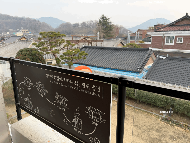 하얀양옥집에서 바라보는 전주한옥마을의 풍경이다. 전통 한옥들 사이에서 시선을 끄는 하얀 외벽의 양옥집으 지나가는 사람들의 발길을 멈추게 하는 매력적인 외관이다.