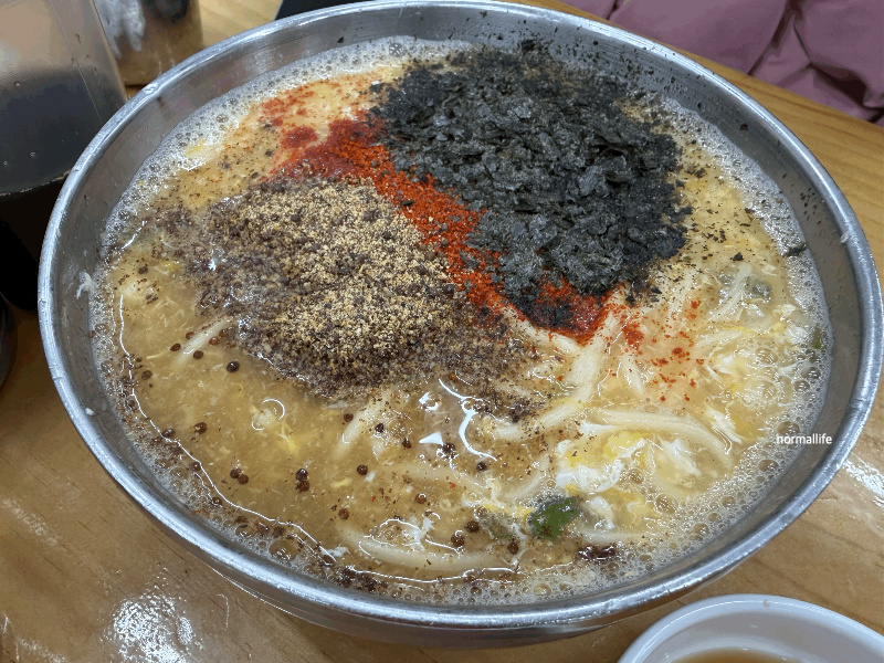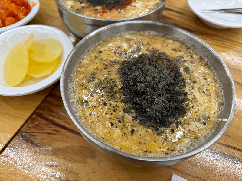 고소한 깨가 듬뿍 올라가 있고, 김가루와 빨간 고춧가루가 넓게 뿌려져 있어 비주얼만으로도 군침이 도는 한 그릇이다. 가루의 고소함, 고춧가루의 은은한 매콤함, 그리고 고소한 깨의 향이 조화를 이루면서 “이게 바로 전주의 맛”이라는 느낌을 준다.