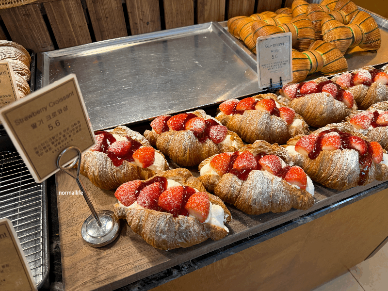 크루아상 위로 생딸기와 크림이 듬뿍 올라가 있어 멀리서도 시선을 단번에 사로잡는 딸기크로와상이다. 겹겹이 살아 있는 크루아상 위에