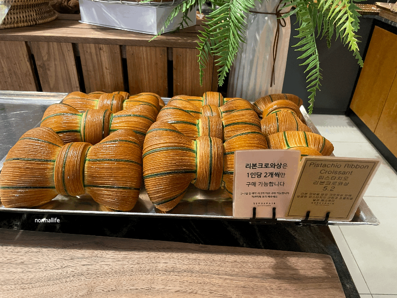 겹겹이 말린 크루아상 결이 리본처럼 묶여 있는 독특한 형태의 리본크로와상이다. 꾸드뱅 케이커스하우스의 대표 메뉴로 1인당 2개씩만 구매가 가능하다. 바삭하게 구워진 크루아상 결 사이로 피스타치오 컬러 라인이 선명하다. 한 입 베어 물면 겉은 바삭하고 속은 속은 크루아상 크림이 부드럽고 초콜릿의 식감이 살아 있다.