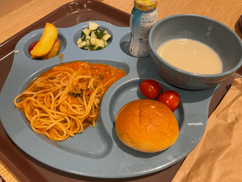 아이 입맛에 맞춘 KIDS 미트스파게티이다. 토마토 스파게티, 부드러운 모닝빵, 감자튀김 & 케첩, 오이무침, 방울토마토, 요구르트, 담백한 수프가 한 트레이에 균형 있게 담긴 세트형 메뉴이다. 한 가지 메뉴에 치우치지 않고 탄수화물, 채소, 간식 요소가 고루 포함되어 있어 아이와 함께 백화점에 방문했다면 한 번쯤 선택해 볼 만한 메뉴이다.