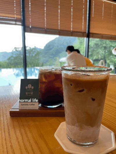 숲너울의 통창으로 보이는 초록 숲과 잔잔한 푸른 풀장을 바라보며 마시는 커피는 마음을 한결 여유롭게 한다. 숲너울은 어느자리에 앉아도 자연을 바라볼 수 있지만 숲과 푸른 풀장을 바라보며 차를 마실 수 있는 창가자리는 누구나 한번 앉고 싶어 하는 공간이다. 숲너울에서 바라보는 바깥풍경은 회색의 콘크리트가 없고 전면이 숲이다 보니 눈과 마음이 시원해지는 느낌이고 계절마다 다른 한 폭의 캔버스를 감상할 수 있다. 숲 속 공간에도 테이블이 마련되어 있는데 그늘에서 휴식을 취하며 차를 마실 수 있고 뛰어놀기를 좋아하는 아이들에게도 푸른 자연과 함께 할 수 있는 좋은 공간이다.