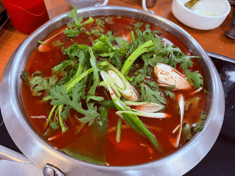 국물 한 숟갈 떠보니 텁텁함 없이 깔끔하면서도 칼칼한 맛이 살아 있는 송어매운탕이다. 자극적인 매운맛이 아니라 누구나 편하게 먹을 수 있는 얼큰함이라 따끈한 흰밥과도 잘 어울리고 라면 사리와 함께 맛보는 것도 별미이다.