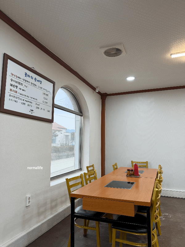 물바위송어장 식당 내부는 전반적으로 깔끔하고 정돈된 분위기다. 테이블 간 간격이 넉넉해 옆 테이블 신경 쓰지 않고 식사하기 좋았고, 여러 명이 함께 앉을 수 있는 넓은 테이블도 마련되어 있어 가족 단위나 모임으로 방문하기에도 무리가 없다. 창가 자리에서는 시골의 바깥 풍경과 양식장이 보여 여유를 즐길 수 있다.