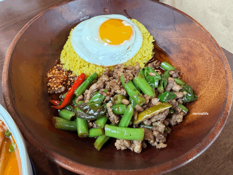 바질 향이 과하지 않고, 돼지고기와 양념의 조합이 깔끔한 돼지고기 바질 덮밥이다. 노른자를 톡 터뜨려 비벼 먹으면 고소함까지 더해져서 순식간에 한 그릇 비우게 되는 라임디쉬의 베스트 메뉴이다. 기름지지 않아서 똠얌누들이랑 함께 먹기 딱 좋은 조합이다.