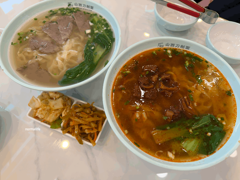 맑은 국물의 산시도삭우육면과 매운 국물의 산시홍소도삭우육면을 주문하였다. 중국 음식이라고 하면 향신료가 강할 것 같은 인상이 있지만 도삭면은 생각보다 호불호가 적은 메뉴이다. 중국 면 요리 중에서도 한 번 먹으면 기억에 남는 메뉴가 바로 도삭면이다.