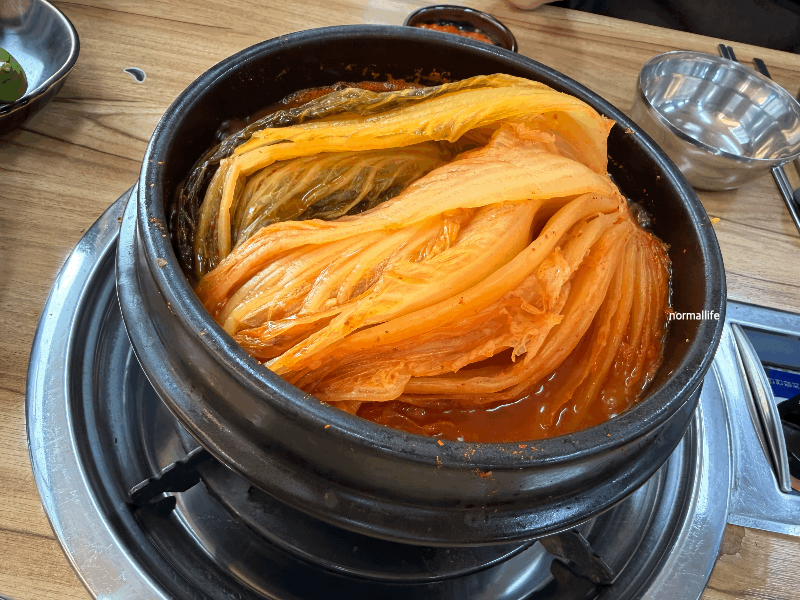 뚝배기에 큼직한 통배추 김치가 그대로 얹혀 나오는 갈비김치찌개의 비주얼은 정말 압도적이었다. 국물은 아래에서 보글보글 끓고 있고 배추 사이사이로 빨간 양념이 스며든 모습이 군침 돌게 했다.