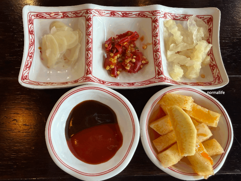 얇게 썬 마늘절임은 국물 요리의 느끼함을 잡아주고, 베트남 고추는 취향에 따라 매콤함을 더할 수 있어 좋다. 매운 무절임은 입안을 깔끔하게 정리해 준다. 하나하나 강한 맛은 아니지만 메인 메뉴를 더 맛있게 즐길 수 있도록 구성된 조연 같은 존재들다.