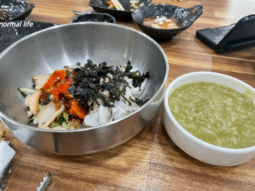 시원한 살얼음이 떠있는 비법육수에 여러 가지 회와 해산물이 들어간 물회가 우리들이 생각하는 물회이지만 #포항물회는 육수가 따로 없이 고추장에 비벼 먹는 게 특징이다. 낯선 포항물회를 처음 접했을 때는 무슨 맛일까 싶었는데 이제는 포항에 방문할 때마다 꼭 찾게 되는 음식이 되었다. 해녀전복집의 물회는 다른 해산물이나 활어회 없이 오직 전복과 신선한 야채, 김가루, 그리고 고추장만 들어가 있어 전복 고유의 맛과 식감을 제대로 즐길 수 있는 물회였다. 전복물회를 어느 정도 먹고 함께 나온 공깃밥도 쓱쓱 비벼 함께 먹으면 별미이다. 해녀전복집은 전복물회를 시키면 따뜻한 전복죽도 함께 나온다. 전복물회와 공깃밥 그리고 전복죽까지 다양하게 즐길 수 있다.