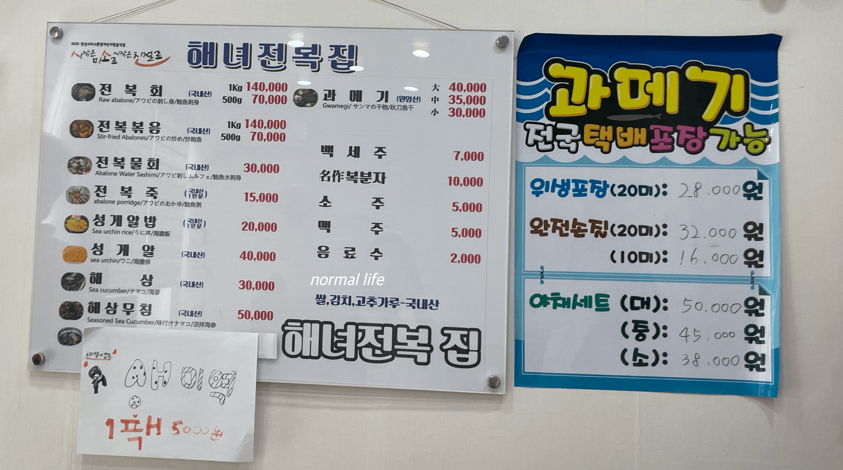 2. 해녀전복집 메뉴와 가격